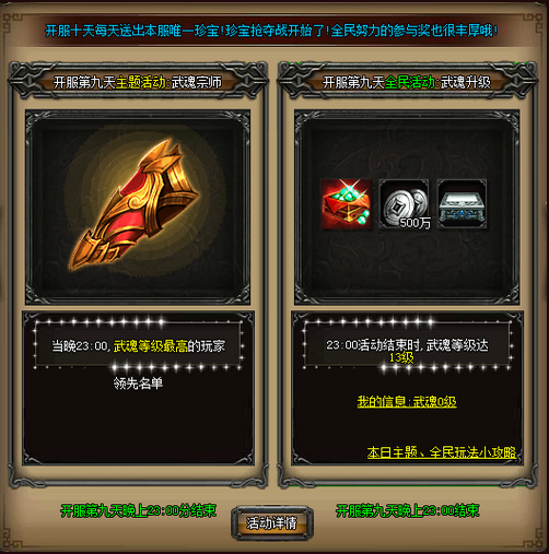 活动详情:开服后,武魂等级最高的玩家将获得珍宝奖励(武易手镯);当天23点结算时,武魂等级达到13级的玩家可以获得全民奖励(坐骑提升丹盒*1、500w绑金*1、炼体提升箱*1)。