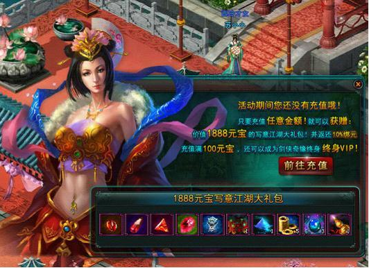 活动时间内,只要玩家的角色是第一次在所在服务器进行充值,不限制任意金额,除了能获得相应的元宝外,还能领取一份价值1888元宝的“写意江湖大礼包”。