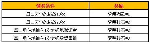 套装材料从哪里来?待我告诉你。活动期间,每日参与天位战,角斗场通关指定次数即可获得奖励。