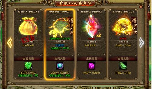 全民奖励:宝石战力分别达到1000、3000、6000的玩家可分别获得二级宝石袋*1、二级宝石袋*2、三级宝石袋*1奖励。