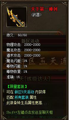 活动内容:逐日传说新篇章,开服首日冲级速度大比拼,只要在开服首日结束时等级达到全服第一,就能立刻获得逆天武器——天下第一神剑!