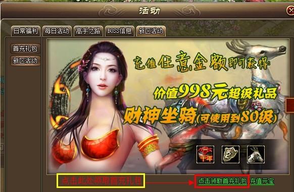注:首次充值不要求具体金额,可以在NPC活动管理员或者游戏右上角活动介绍页--新服活动--首充礼包点击领取;