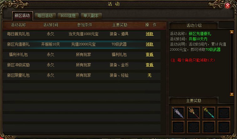 活动说明:只要累计充值达2万元宝,即可领取70级职业武器一把(白虎战剑、火灵法杖、青龙道剑)(注:每个角色只能领取一次,重复领取无效)