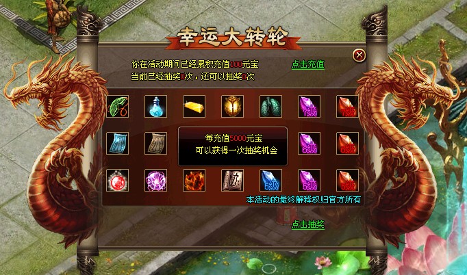 活动内容:新服前三天,玩家每充值5000元宝即可获得一次抽奖机会,
