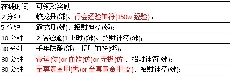 活动内容:每个新创建角色,进入游戏后,在屏幕右上方有“礼”的图案,在线时间达到相应规定,即可获得奖励。