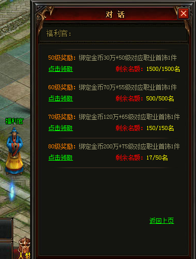 活动内容:只要在领奖名额满员之前,升级到50、60、70、80级即可到烈焰城“福利官”NPC处,领取新区冲级奖励(注:免费领取,名额有限,不可错过哦)