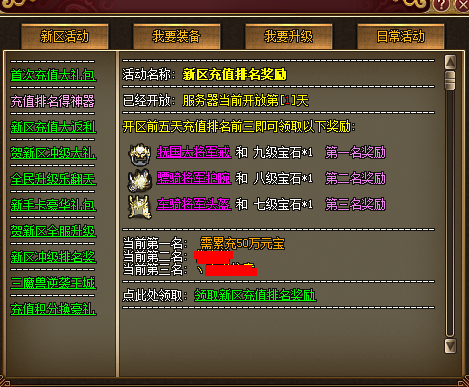 【活动内容】开服5天内累计充值排名前3的玩家,活动结束后即可额外获得丰厚的奖励。