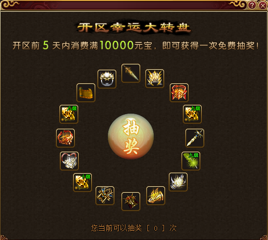 【活动内容】活动期间,消费满10000元宝即可获得一次抽奖机会,抽取极品道具!