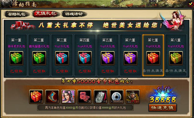 单笔充值1000金币,即可额外获得超值礼包*6;