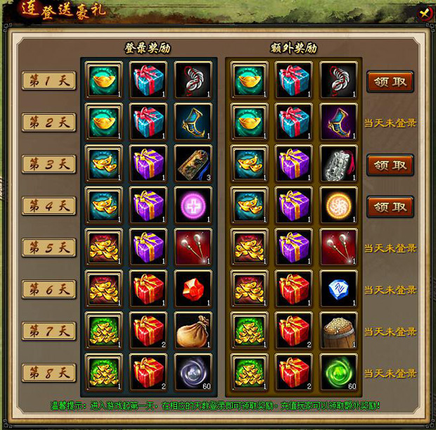 活动内容:在活动期间内,每天连续登录后即可在“八日连登”界面领取登陆礼包,领取后,在包裹中查看使用。充值玩家除了领取登录奖励外,还可以领取额外奖励。