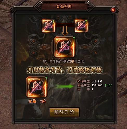 活动时间:开服第七天开启装备升阶功能,可消耗同等级装备将装备升阶--永久
