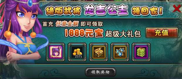 活动内容:活动期间,充值任意金额即可领取1888元超豪华首充礼包,并把绝版武将龙吉公主领回家!