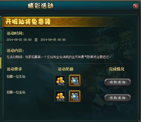 活动内容:在活动期间,玩家招募第一个玄仙和金仙消耗的金币和勇气勋章将全额返还。