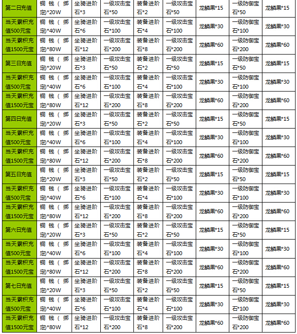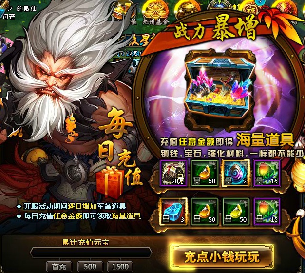 【活动内容】:从开服当日起,只要您参与首充888元宝档活动后,第二日继续在游戏内充值,无论金额多少,即可获得每日充值大礼包,宝石、铜币等海量道具大派送!