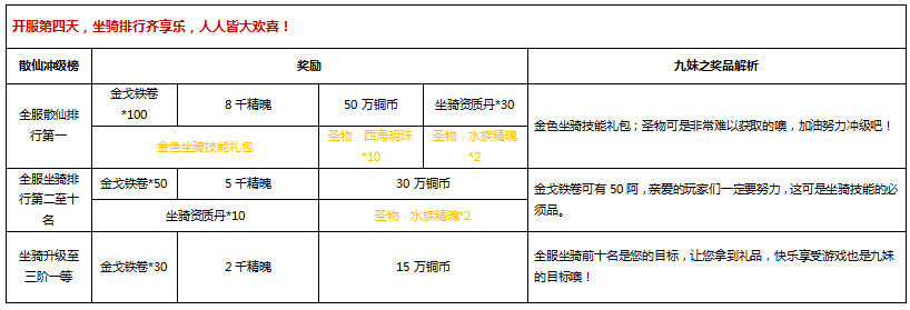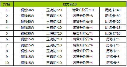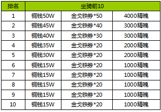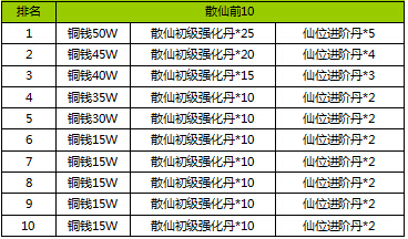 【活动内容】每天0点时排行榜中的战力、等级、封神台、翅膀、坐骑、散仙排行榜的前10名玩家可获得高额的奖励。
