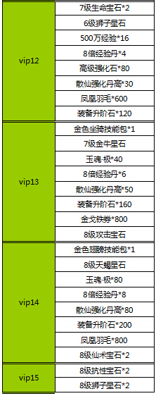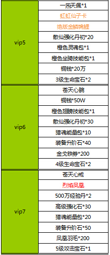 【活动内容】累计充值达到不同的vip等级,每个vip等级都有福利倾情相送!不仅包含各种珍贵实用的道具,珍稀装备、拉风坐骑、高级宝石更是应有尽有!还有橙色散仙、红色散仙等你拿~