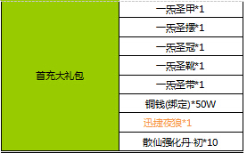 【活动内容】:从开服当日起,只要您是首次在游戏内充值,无论金额多少,除了能得到相应的元宝之外,还将额外获赠全套橙色防具!还有绝版坐骑送哦!