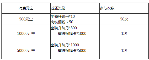活动期间,每日消费达到500元宝,即可获得一份丰厚的奖励,每天最多可以参与50次。