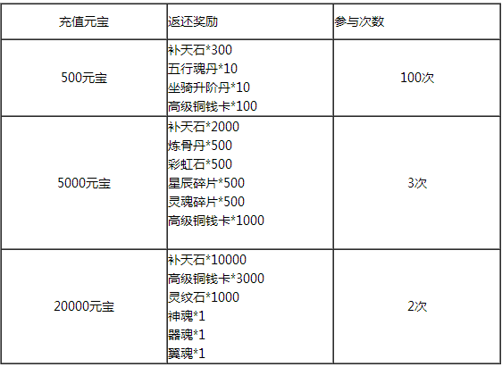 活动期间,每充值达到500元宝,即可获得一份丰厚的奖励,每天最多可以参与100次。
