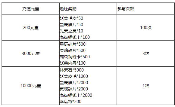 活动期间,每充值达到200元宝,即可获得一份丰厚的奖励,每天最多可以参与100次。