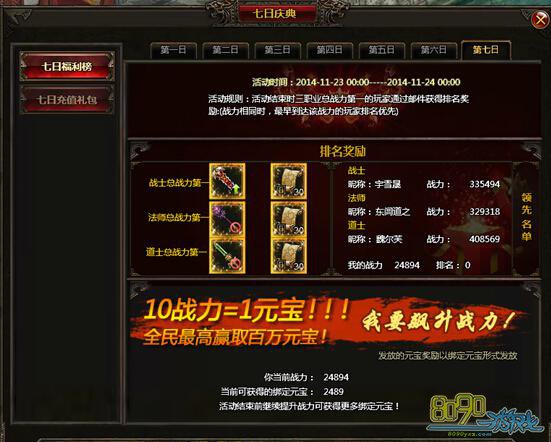 【活动内容】新区开启后的7天内,每天有一个目标要求,凡达成要求的玩家即可领取对应的“全民奖励”,最后一天根据所达到的战斗力,更可领取海量元宝,达到排名奖励要求的玩家,可获得当日的超级豪礼。