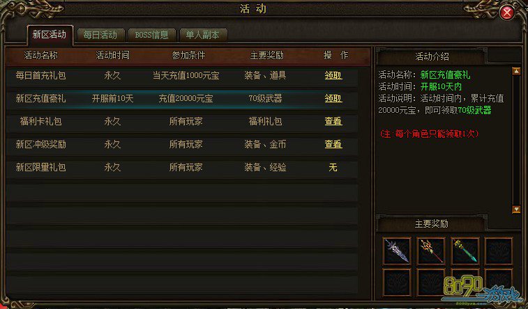 活动说明:只要累计充值达2万元宝,即可领取70级职业武器一把(白虎战剑、火灵法杖、青龙道剑)(注:每个角色只能领取一次,重复领取无效)