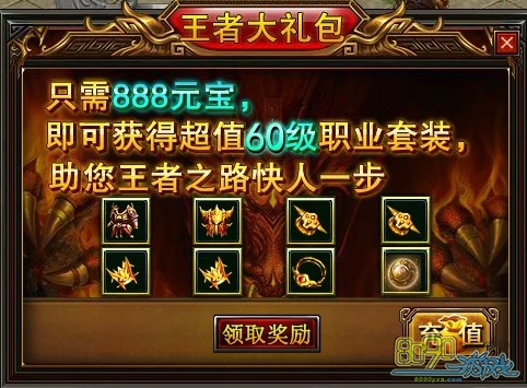 礼包内容:王者大礼包(888元宝):三职业60级职业套装(战神、堕落、乾坤)+50级服装+战魂珠(中)