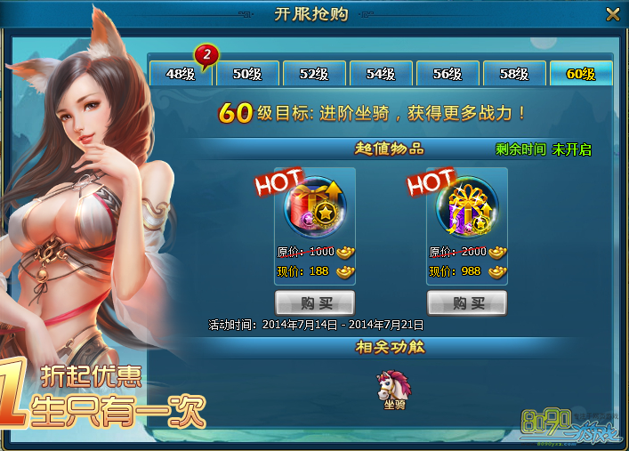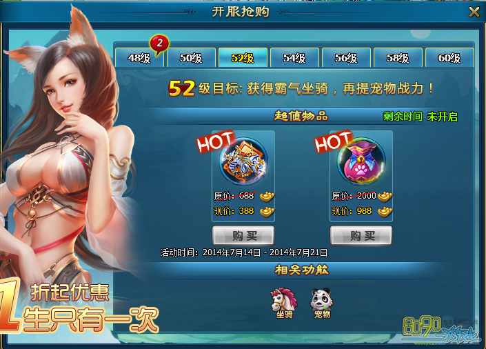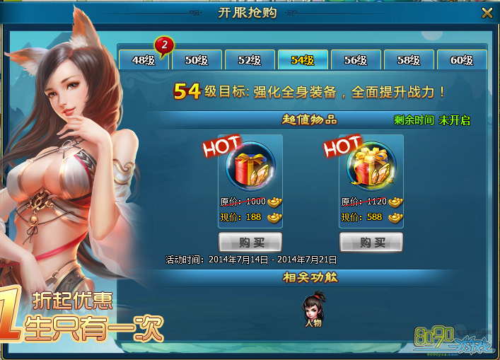 活动内容:开服后,自48级开始,每2级都会增添新的抢购内容,这样天理不容的强力道具组合只能在开启后存在1天哦,过时就会失去购买机会(开服抢购活动结束后,还会出现限时抢购哦,同样包含大量超值道具)