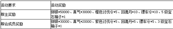 活动内容:活动期间,帮会等级达到3级或以上可自动参与本活动,帮主及所有成员均能获得奖励!
