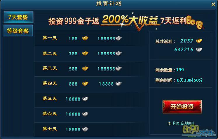 活动内容:活动期间内,玩家可通过活动页面购买对应的投资计划,每种投资返利只能购买一次.