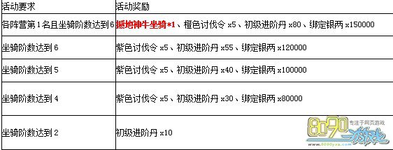 活动内容:开服第4天24点,统计坐骑排行榜,各阵营坐骑排行第一名及坐骑达到对应阶数者均能获得奖励,同坐骑战力按达成时间先后顺序排列。