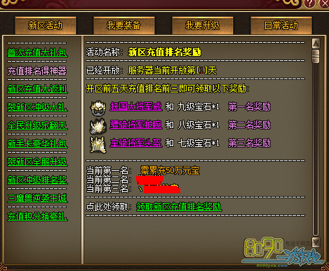 【活动内容】开服5天内累计充值排名前3的玩家,活动结束后即可额外获得丰厚的奖励。