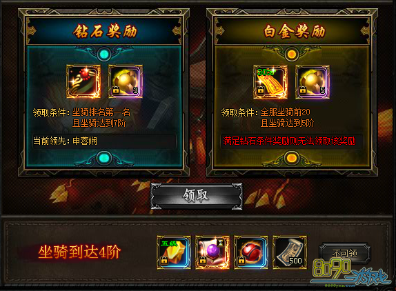 活动内容:活动时间内,坐骑排行榜前20的玩家并达到活动要求可获得丰厚奖励,坐骑达到5阶的所有玩家均可领取坐骑奖励。