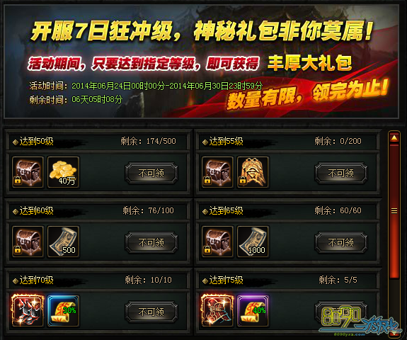 活动内容:活动期间,只要达到指定等级,即可领取冲级大礼包。(礼包数量有限,领完为止)