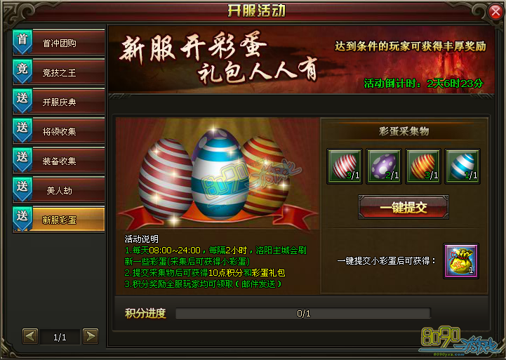活动期间,每天08:00~24:00,每个2小时,洛阳主城会刷新一些彩蛋(采集后可获得小彩蛋)。提交小彩蛋后可获得10点积分 和 彩蛋礼包。积分达到一定进度,将邮件发放全服积分奖励哦。