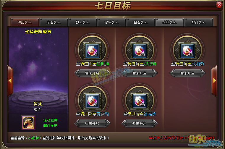 活动期间,玩家进阶相应坐骑,即可领取对应数量 低级进阶丹 。活动结束时,占据坐骑排行榜第一的玩家更有机会获得 赤兔(永久) 哦。