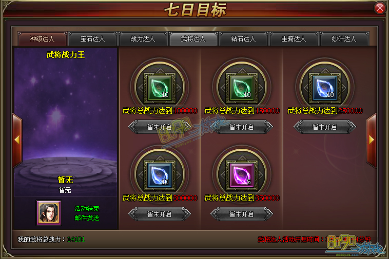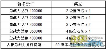 活动期间,玩家达到相应总战力,即可领取 高级宝石。活动结束时,占据总战力排行第一的玩家更有机会获得 50级本职业神级武器箱 哦。