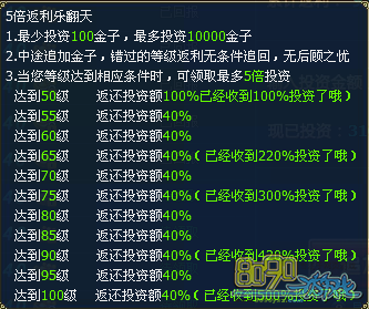 5倍返利乐翻天:玩家可选择100-10000金子进行等级投资,只要人物角色达到对应等级即可获得相应比例的绑金返还,返利额度高达5倍!机会难得不容错过哟!