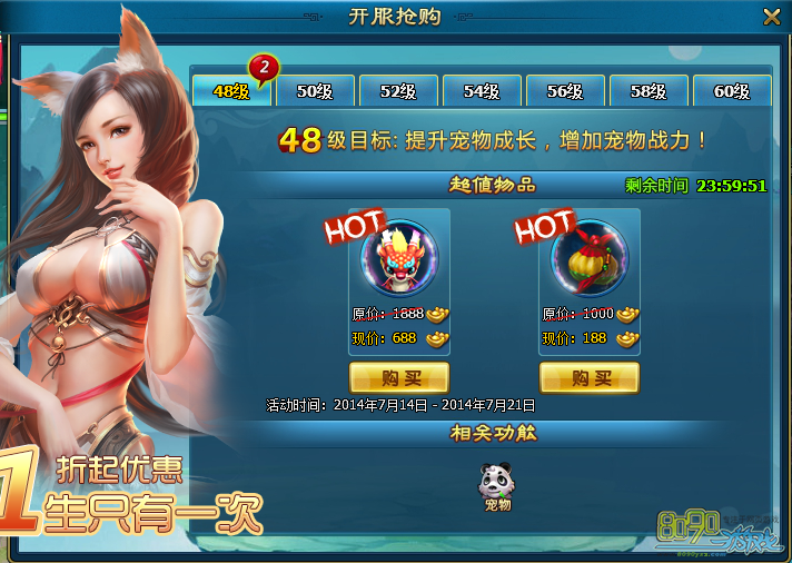活动内容:开服后,自48级开始,每2级都会增添新的抢购内容,这样天理不容的强力道具组合只能在开启后存在1天哦,过时就会失去购买机会(开服抢购活动结束后,还会出现限时抢购哦,同样包含大量超值道具)