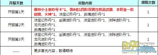 【活动内容】当前新服活动期间,玩家充值任意金额即可领取首充大礼,首充活动每天一次,奖励按照首充次序领取。