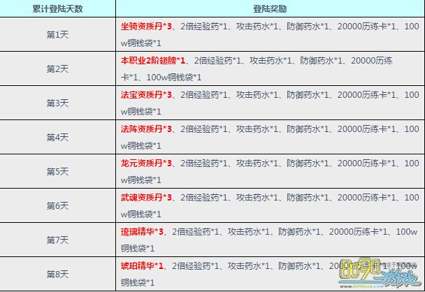 注明:首充与累充奖励随活动天数变化,包含坐骑/法宝/法阵/守护/龙元/武魂等幻形丹。
