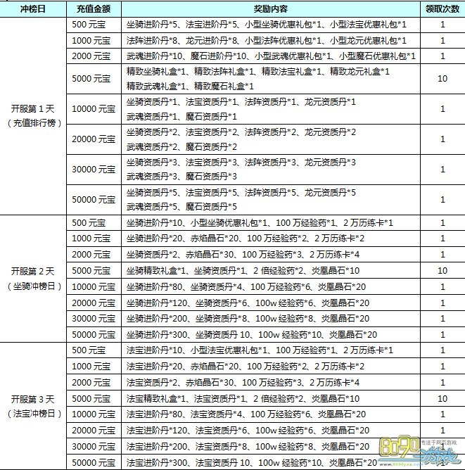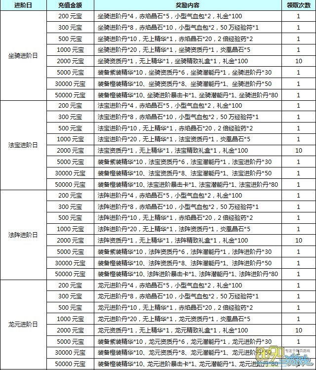 注明:首充与累充奖励随活动天数变化,包含坐骑/法宝/法阵/守护/龙元/武魂等幻形丹。