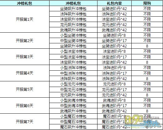 【活动内容】活动期间玩家可购买超值特卖礼包,礼包对应当天排行榜活动系统,玩家可根据礼包类型进行购买,每种礼包只限购一天。