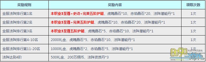 【活动内容】活动时间内符合活动条件及法阵等阶排名前20可领取丰厚大奖,自新服开启第4天晚上24:00结算法阵排行榜。