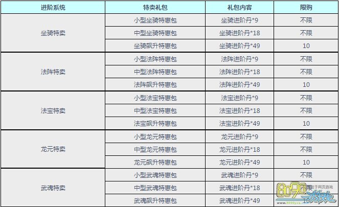 【活动内容】活动期间玩家可在返利大厅-特卖大酬宾中购买超值特惠礼包,礼包内容对应当天进阶日系统。