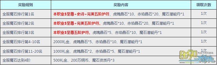 【活动内容】活动时间内玩家魔石排行达到要求及前20名可获得超级大奖,自新服开启第7天晚上24:00结算战力排行榜。