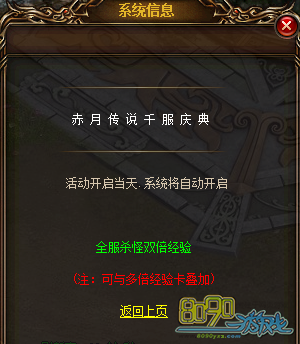 活动内容:千服活动开启当天.系统将自动开启全服刷怪双倍经验(注:可与多倍经验卡叠加)