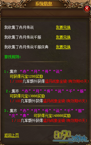 3、集齐 “赤” “月” “传” “说” “百” “服” “庆” “典” 8个字可获得元宝148888奖励 1/10几率额外获得隐藏坐骑猛犸战象坐骑