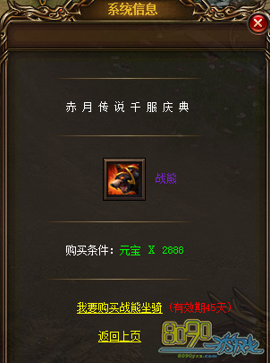 活动内容:活动期间内可找活动使者花费2888元宝购买1只绝版战熊坐骑