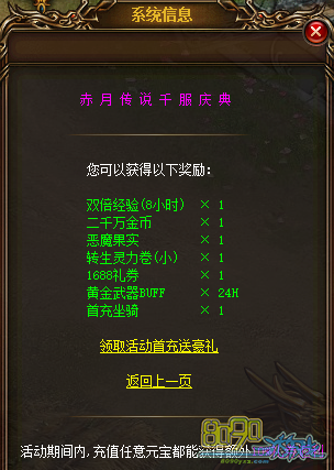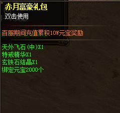 活动期间内,累计充值10w元宝可获得赤月富豪礼包